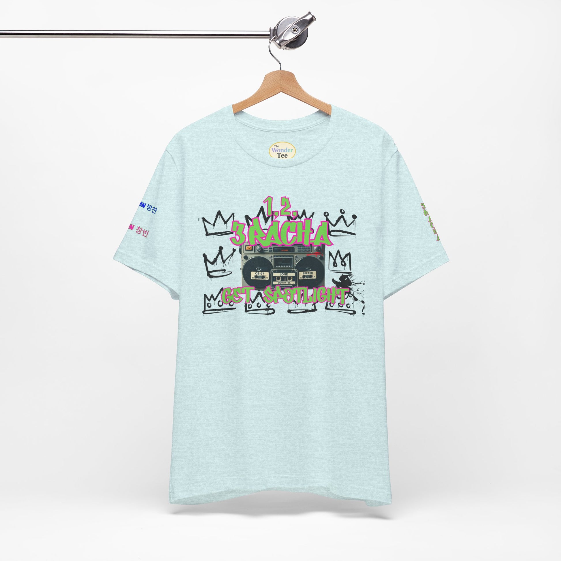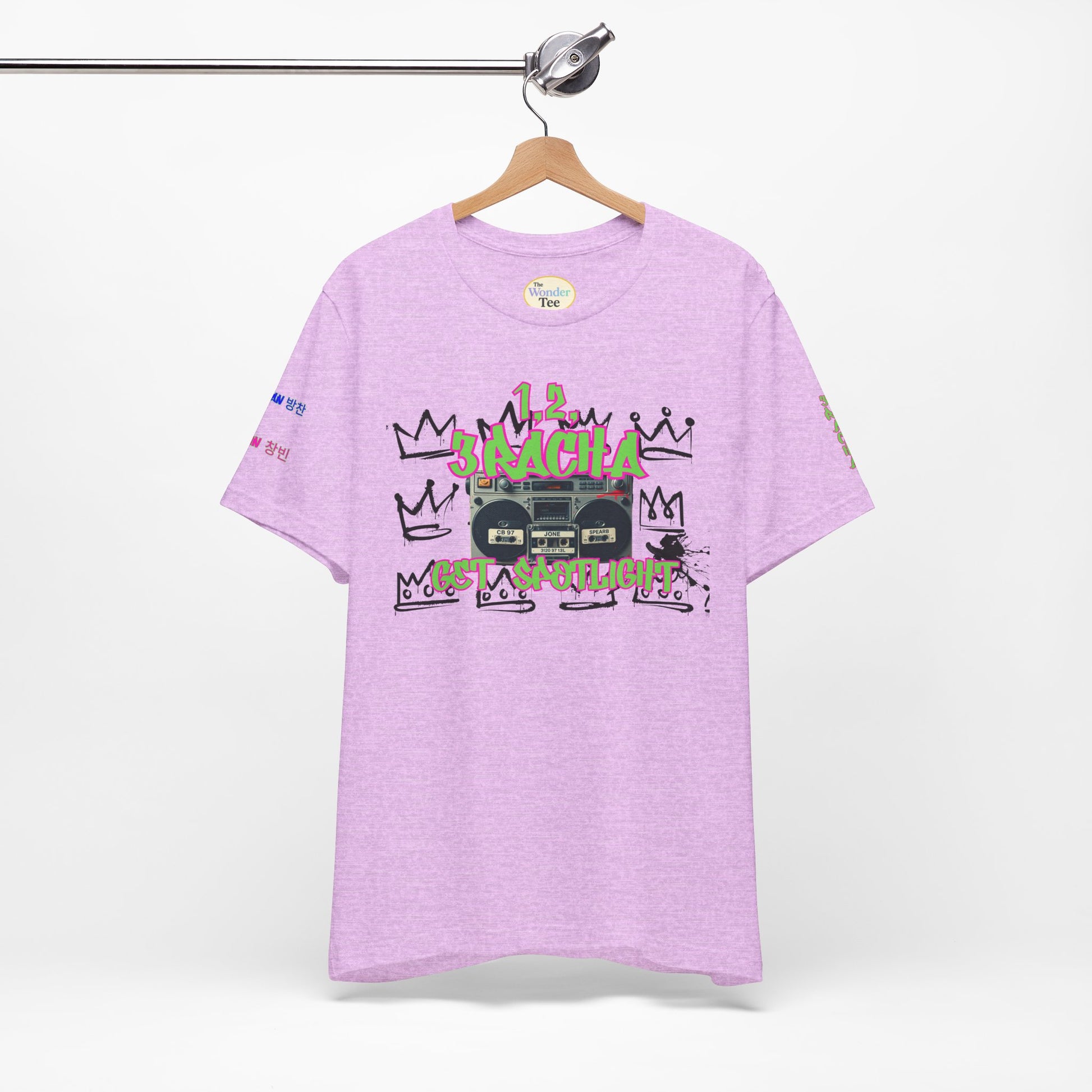Turn up the volume and rep your bias with this bold vintage-inspired tee featuring a retro boombox and 3RACHA’s iconic call: “1.2.3RACHA, Get Spotlight!”
