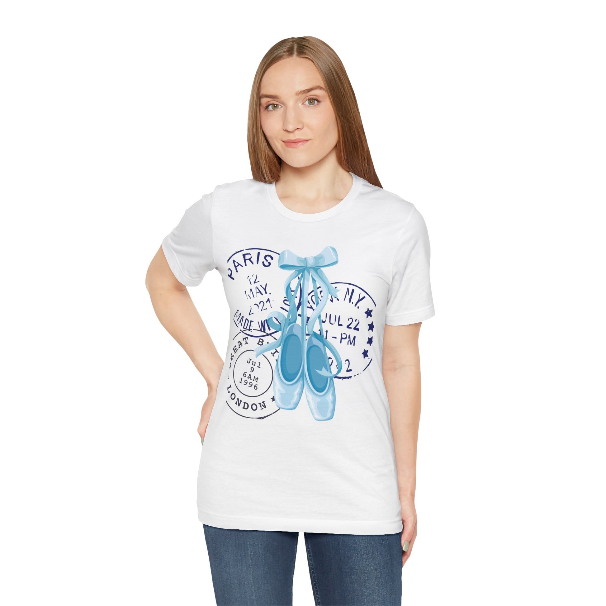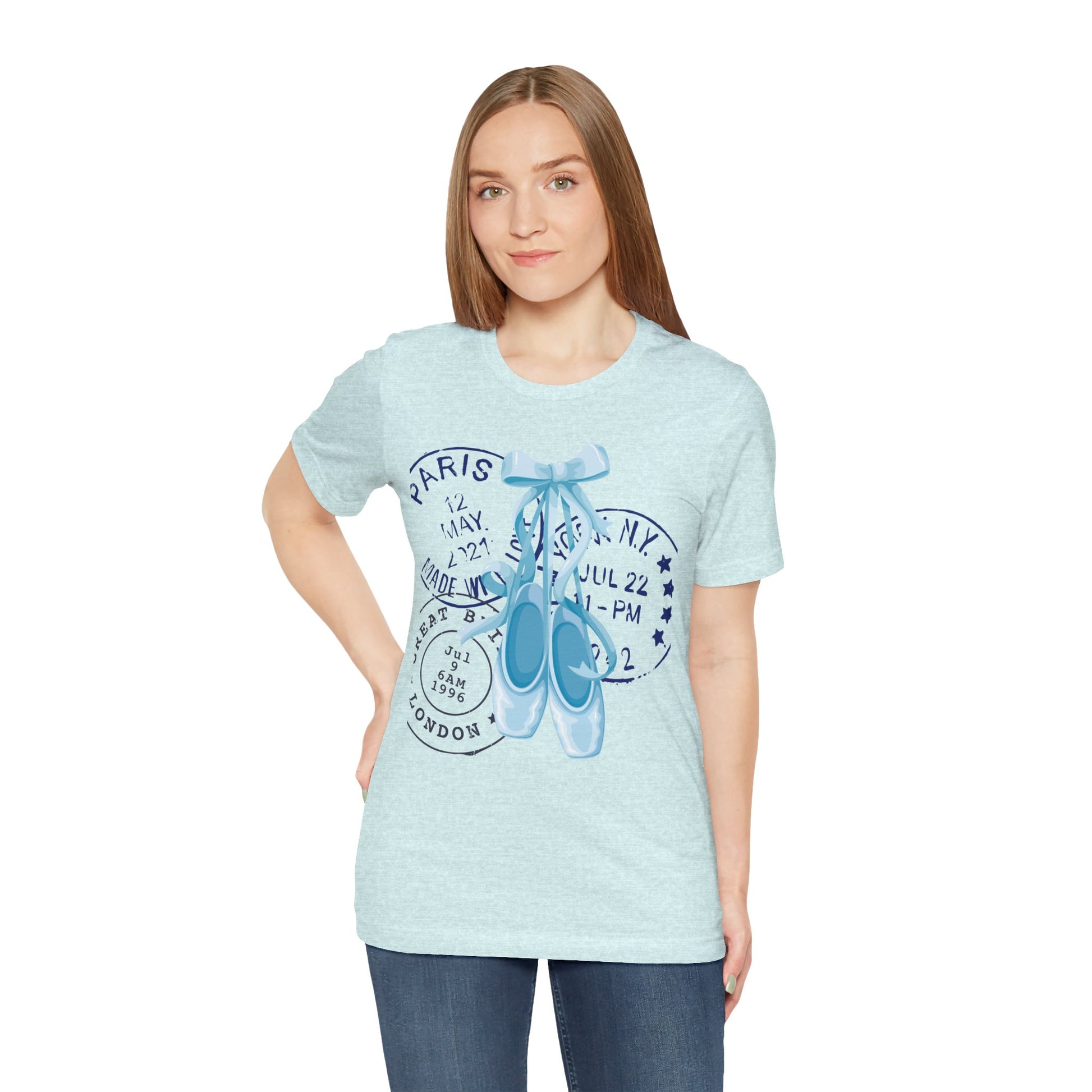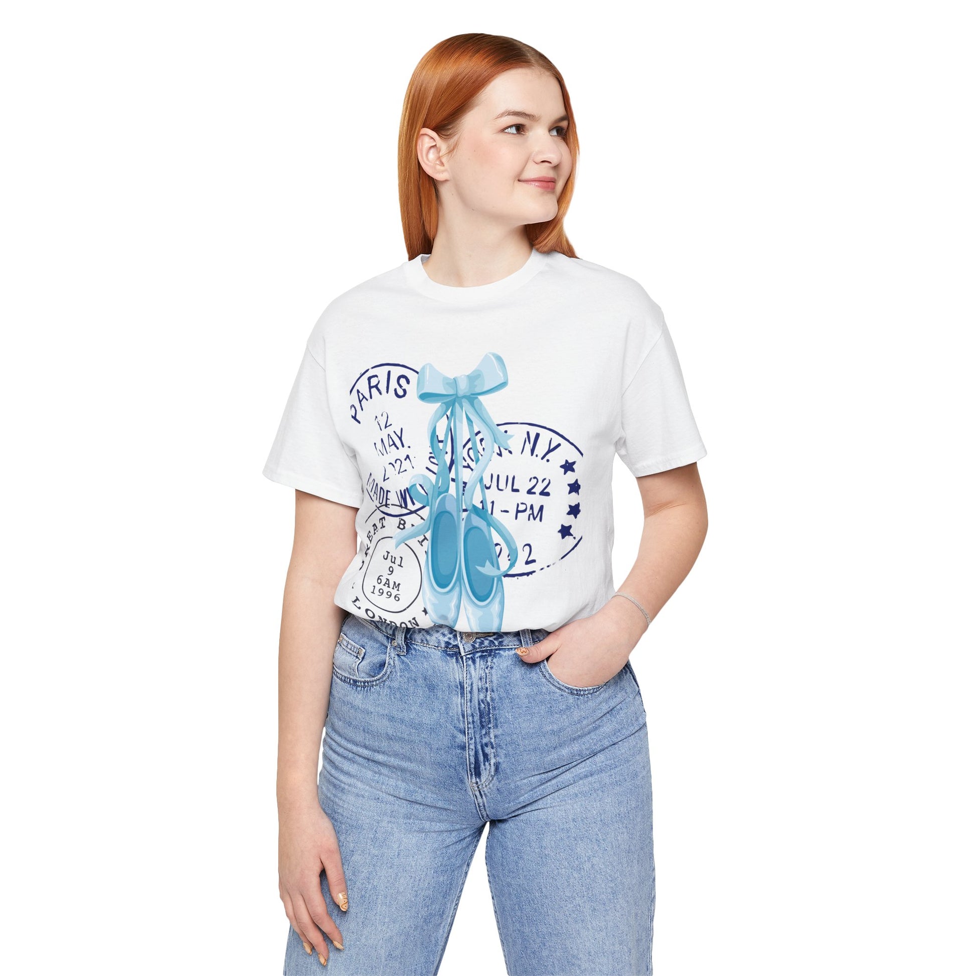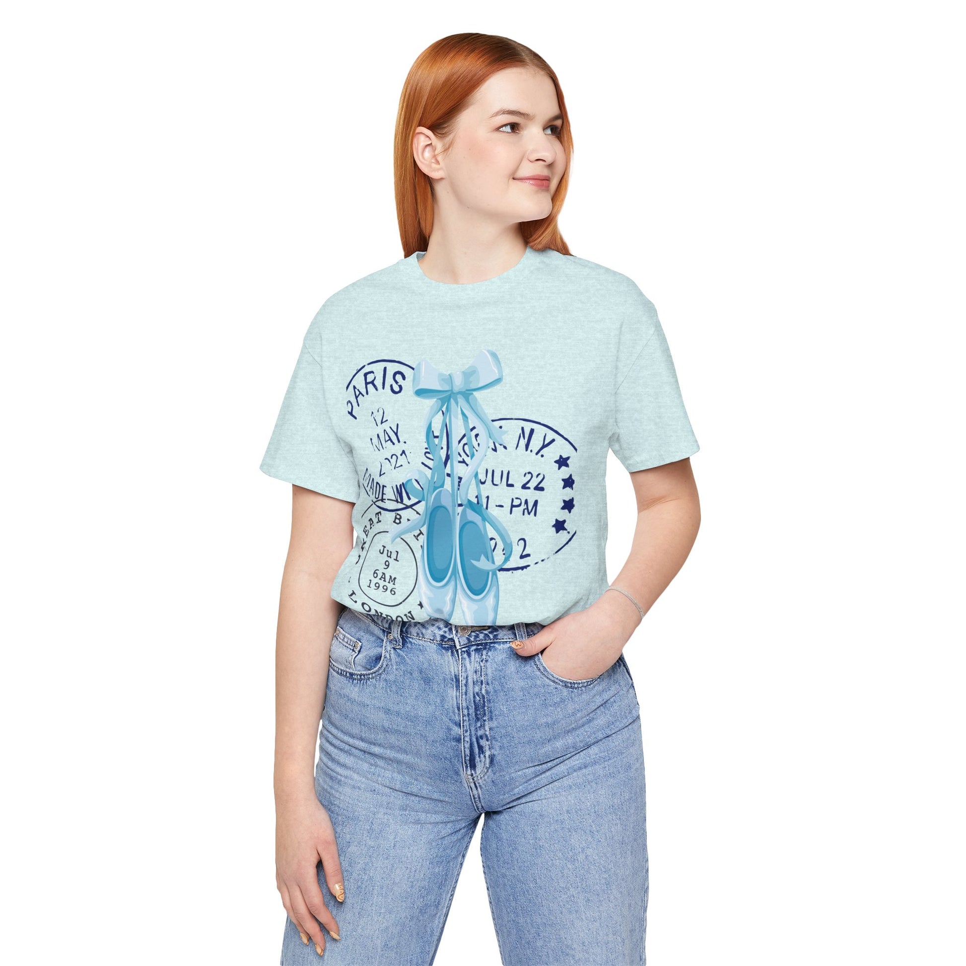 Grace meets wanderlust in this dreamy tee featuring delicate blue on-pointe ballet shoes paired with vintage-style postal stamps. A soft blend of movement and memory, this design is perfect for those who live with their head in the clouds and their feet ready to dance.