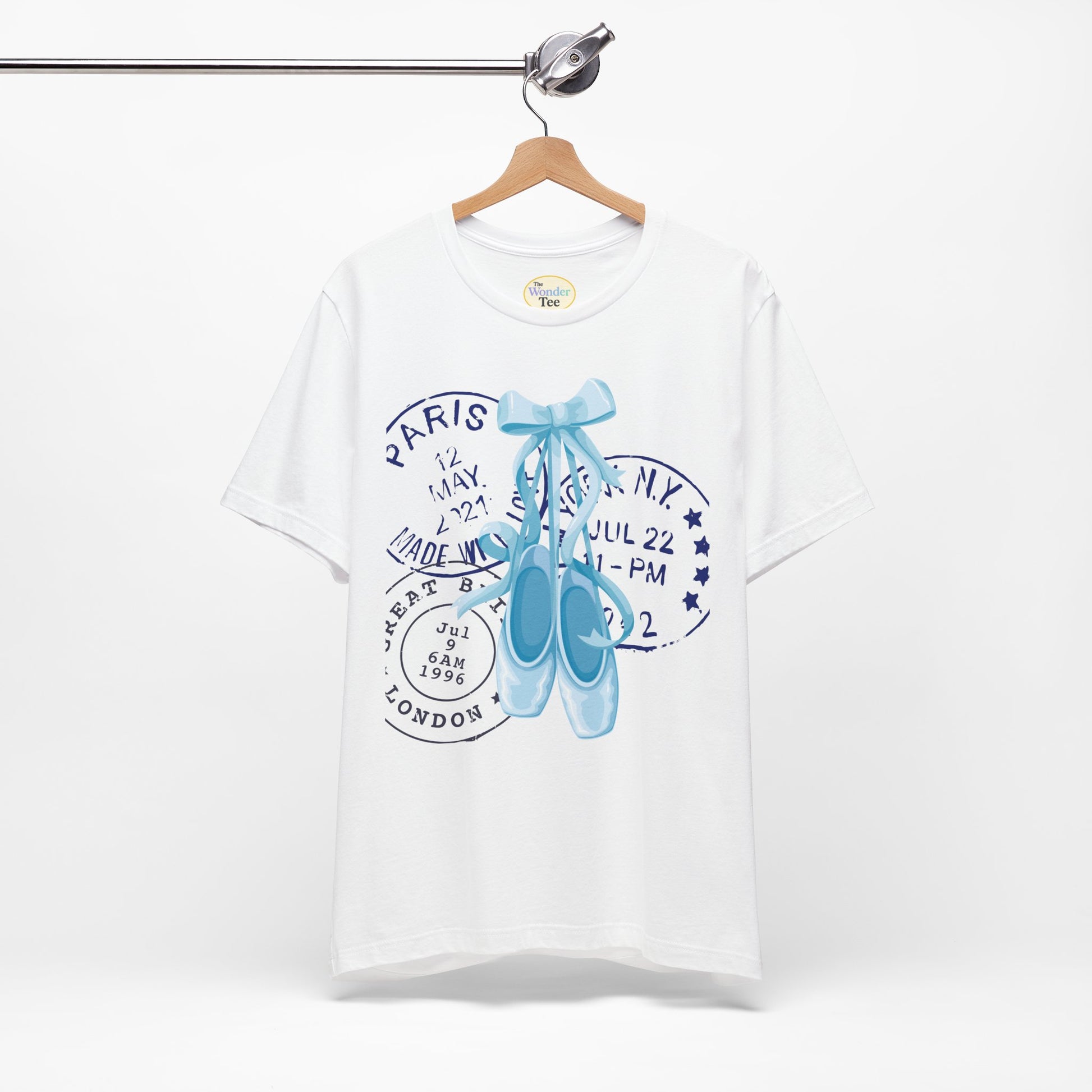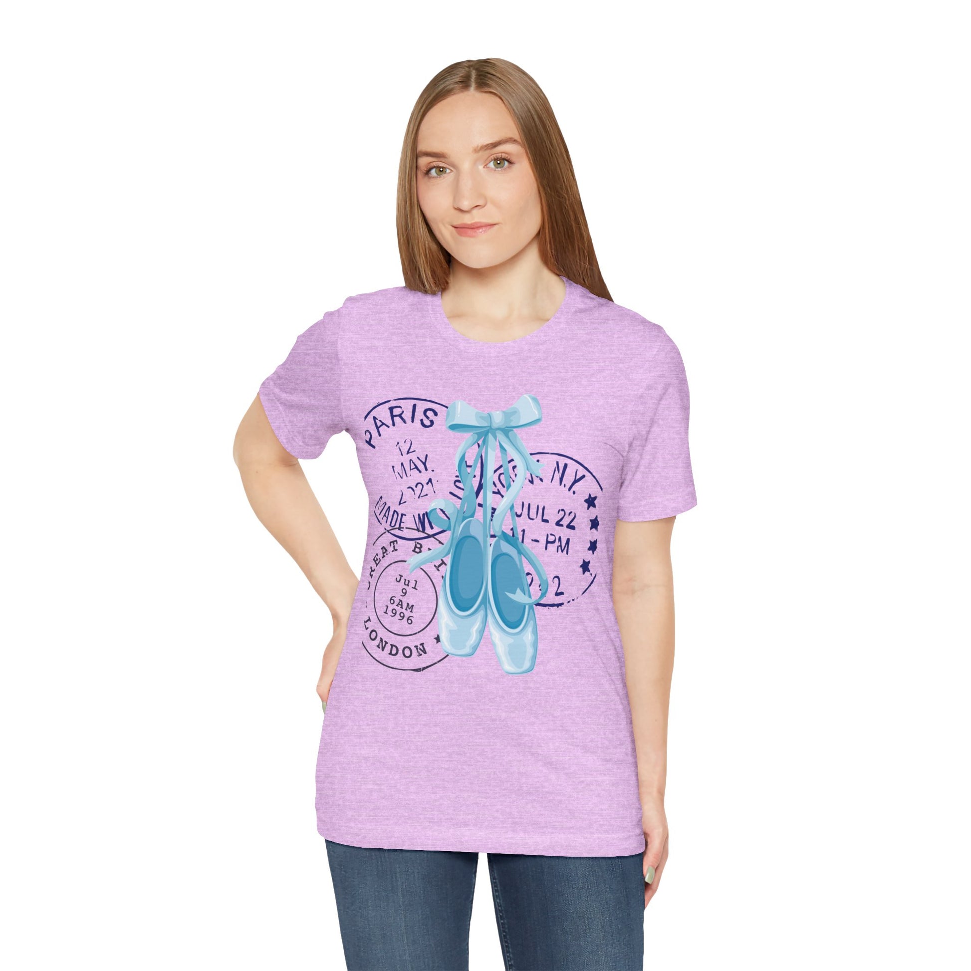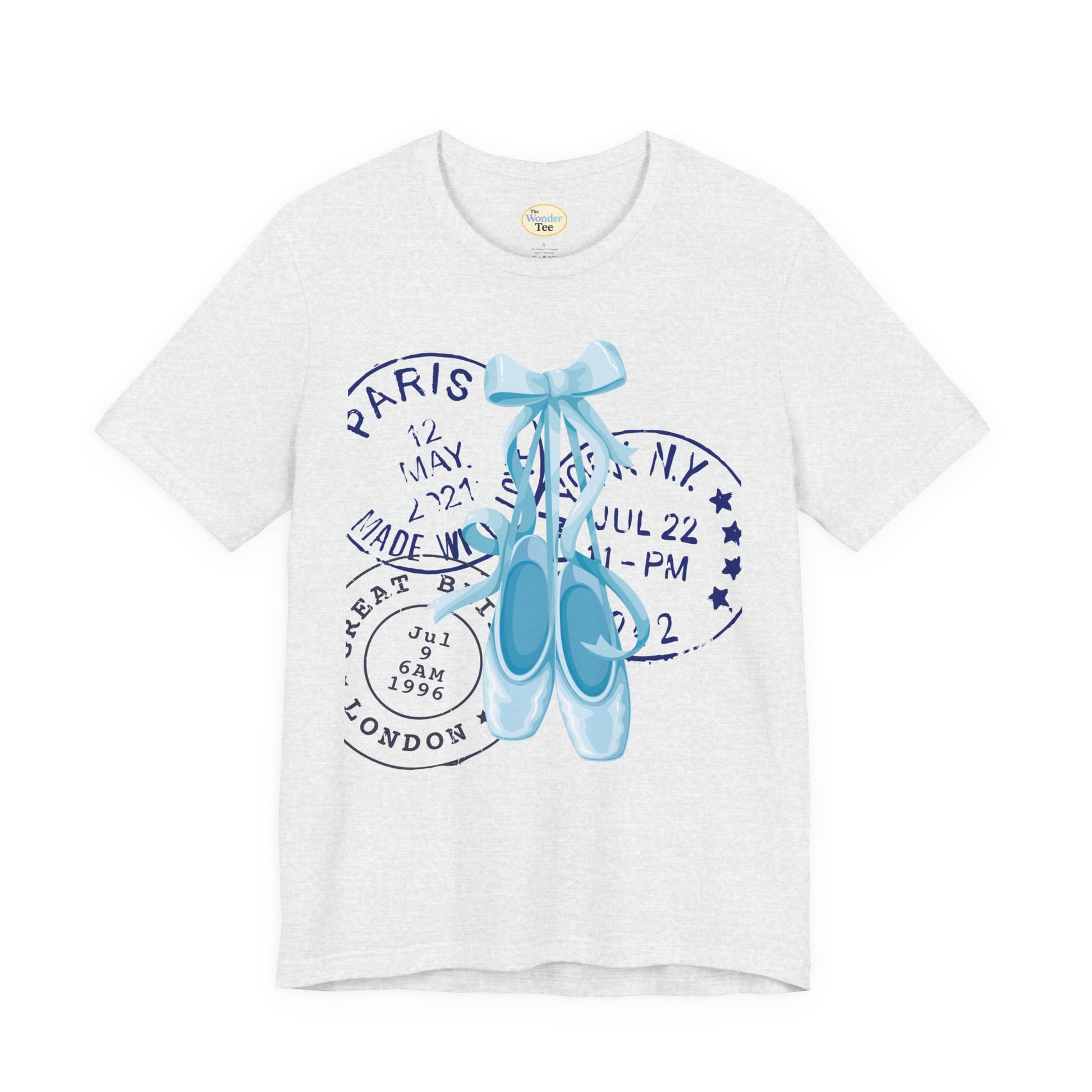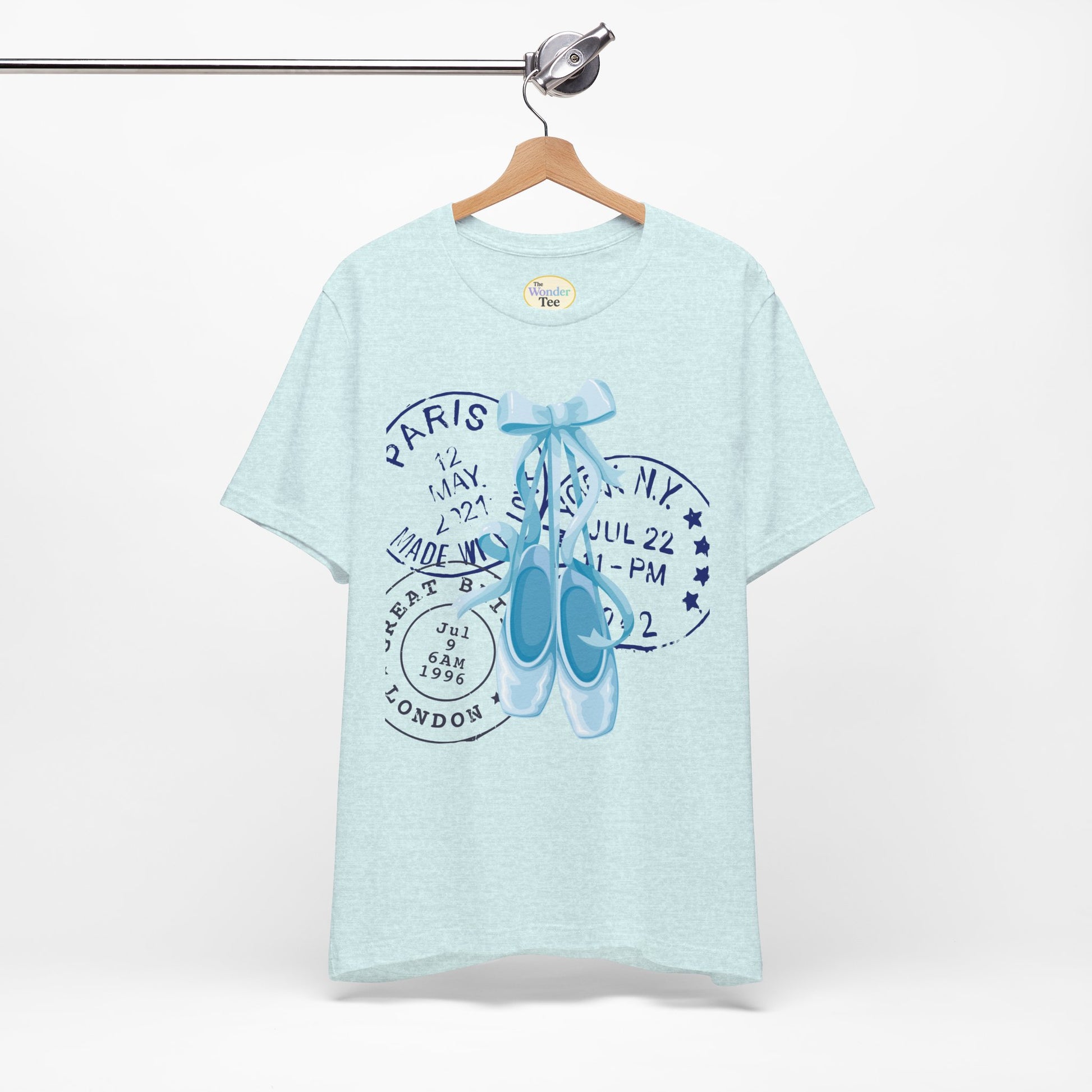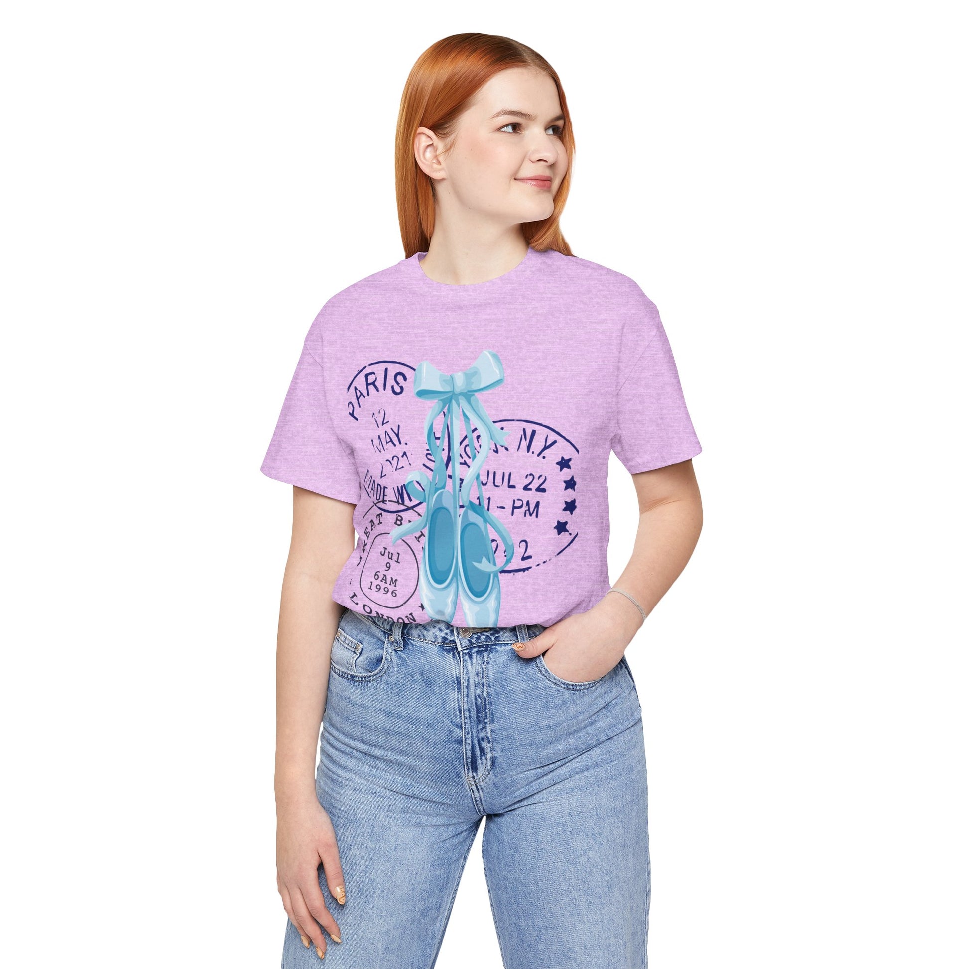 Grace meets wanderlust in this dreamy tee featuring delicate blue on-pointe ballet shoes paired with vintage-style postal stamps. A soft blend of movement and memory, this design is perfect for those who live with their head in the clouds and their feet ready to dance.