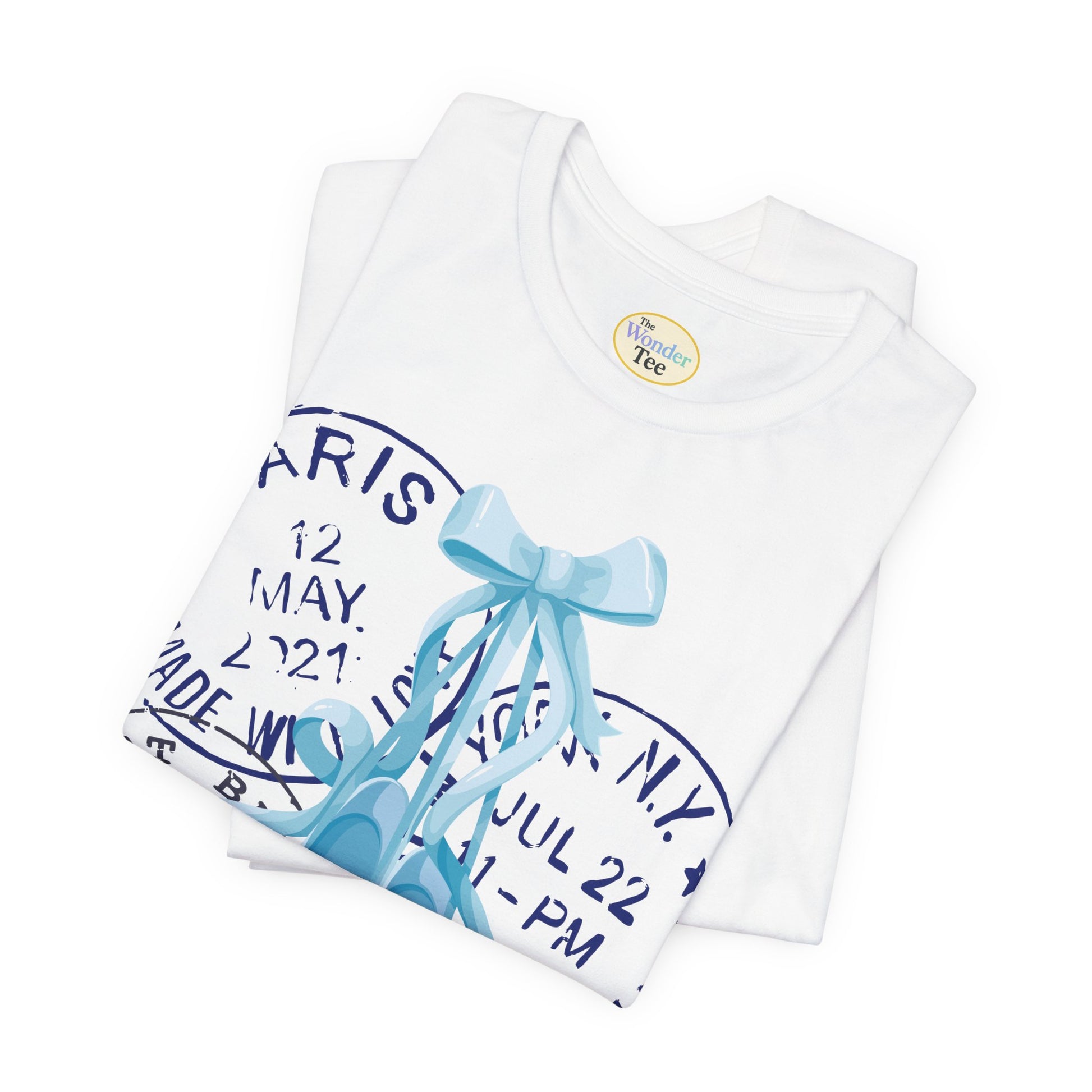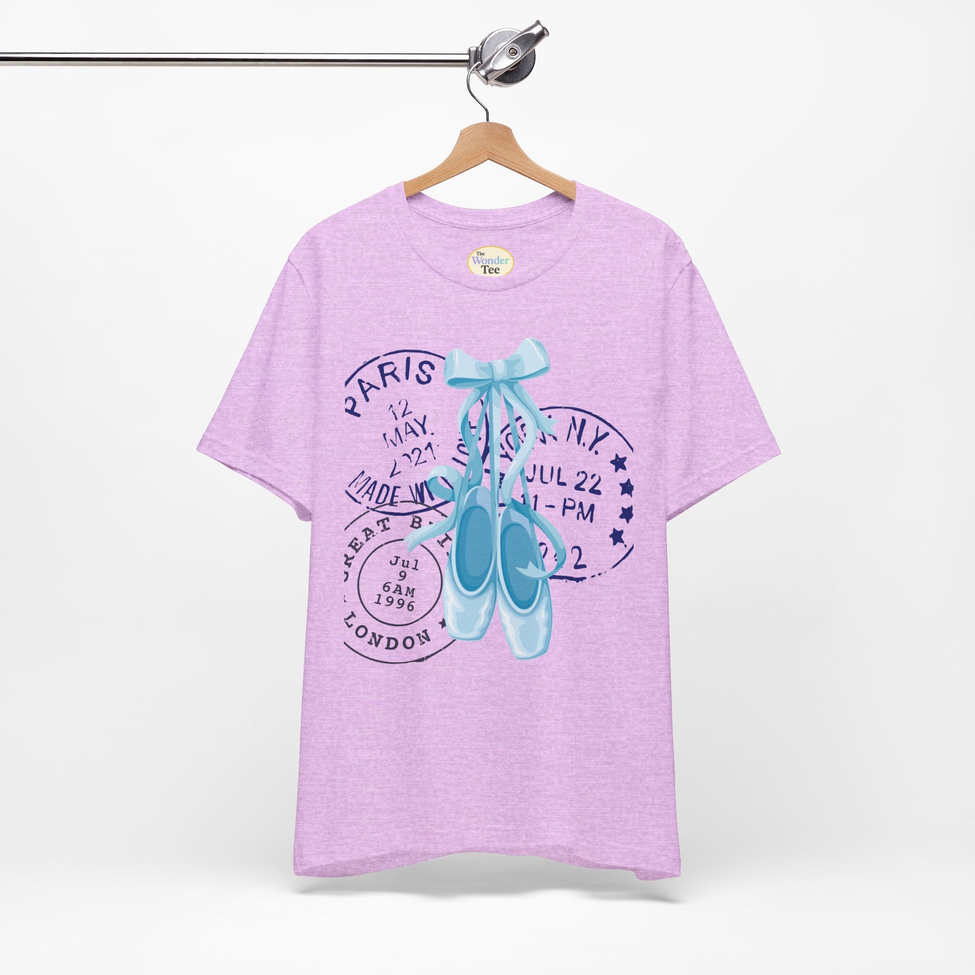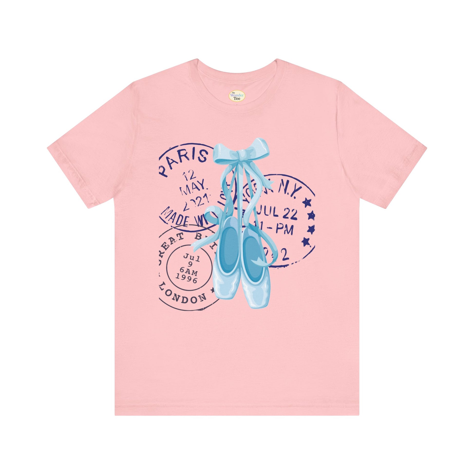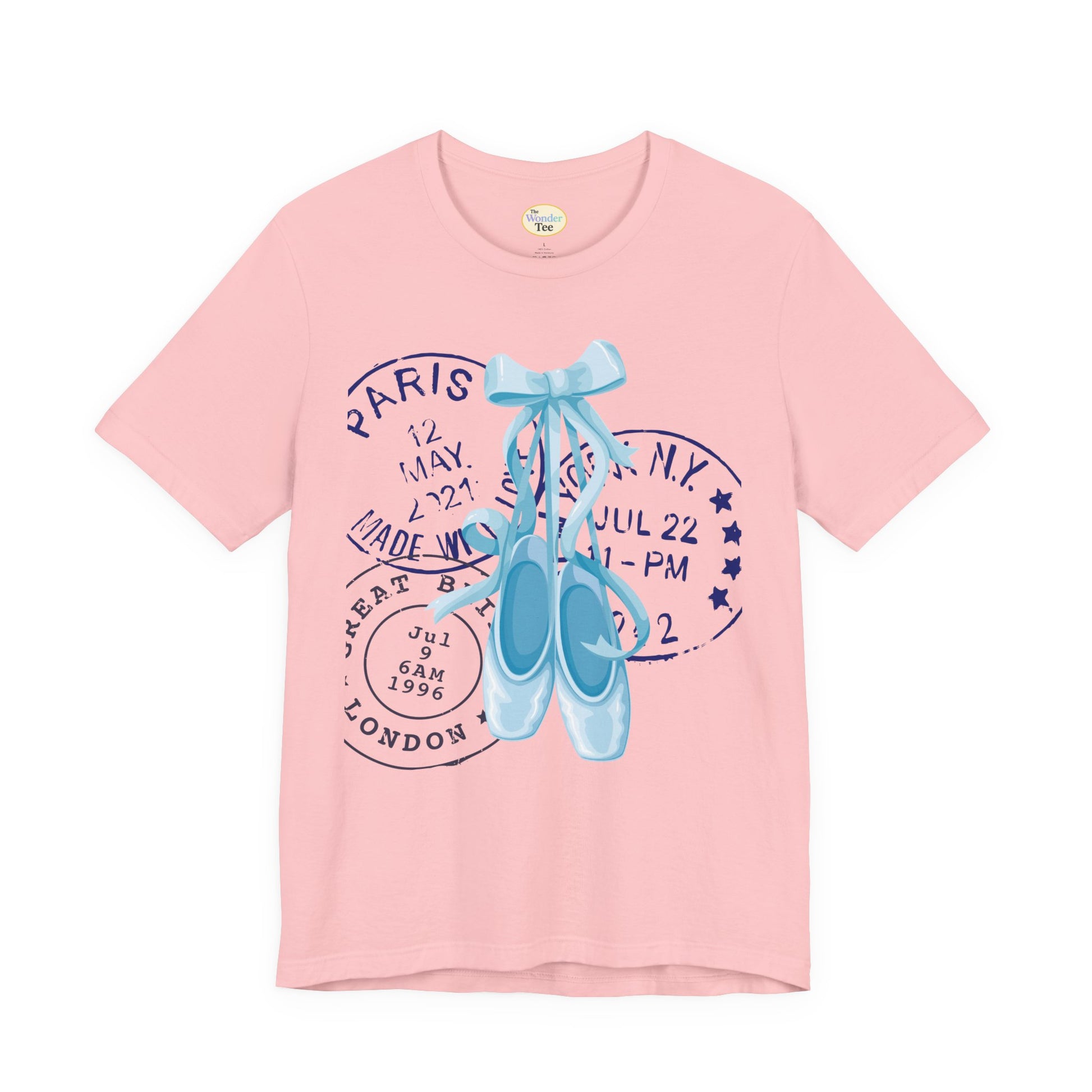 Grace meets wanderlust in this dreamy tee featuring delicate blue on-pointe ballet shoes paired with vintage-style postal stamps. A soft blend of movement and memory, this design is perfect for those who live with their head in the clouds and their feet ready to dance.